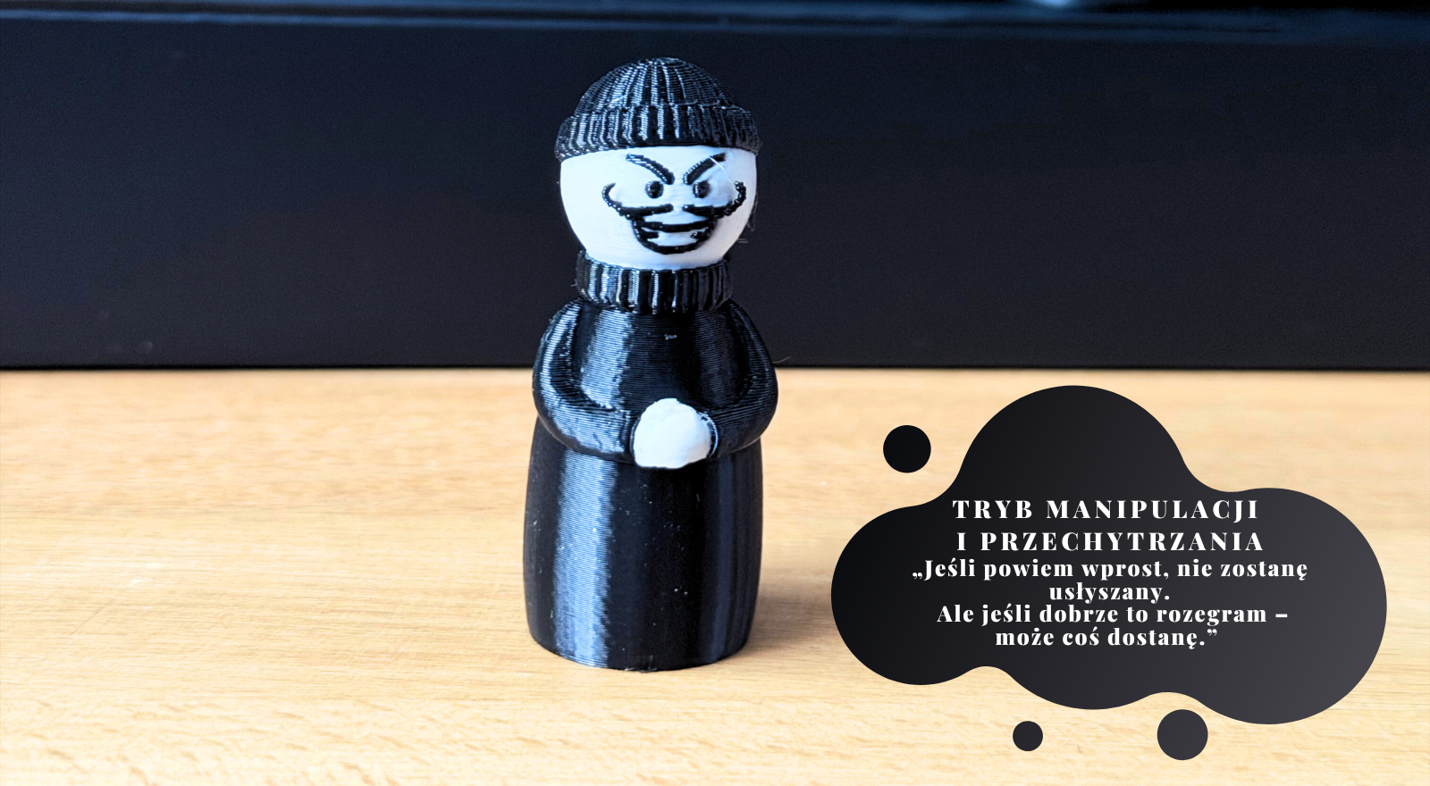 Tryb Manipulacji i Przechytrzania (Oszust/Manipulator) to sposób radzenia sobie, który rozwija się wtedy, gdy w przeszłości bezpośrednie wyrażanie emocji, potrzeb i granic było nieskuteczne, karane lub ośmieszane. Osoba w tym trybie próbuje zaspokoić swoje potrzeby pośrednio – poprzez wzbudzanie współczucia, obrażanie się, wycofywanie emocjonalne, testowanie drugiej osoby, stosowanie poczucia winy, półprawd czy groźby utraty relacji. Choć słowo „manipulacja” kojarzy się negatywnie, w tym ujęciu jest to strategia przetrwania wykształcona najczęściej w dzieciństwie, w warunkach braku emocjonalnej responsywności i realnego wpływu.